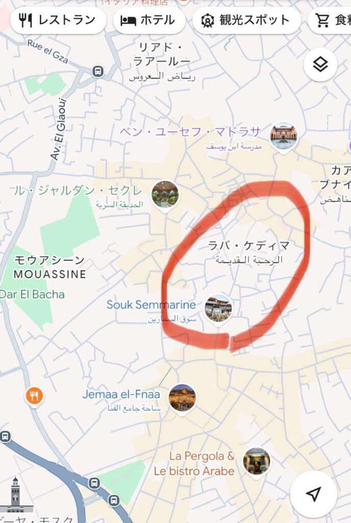 フナ広場付近にあるレストランで、「タジン」が食べられるお店を検索し、ランチを食べた後、『スーク』探索を始めます。