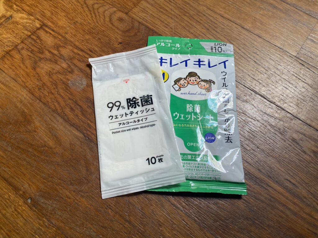 手を洗うことができないので、除菌シートは全バックのポケットに仕込ませています。